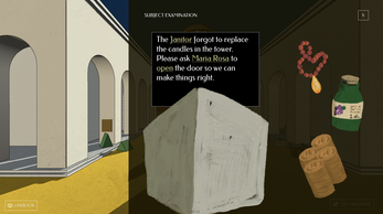 The Sacred Plane is a fill-in-the-blank deduction game. Your role is as a Censor for a religious hegemony based upon geometric ideals. In Act 1, you must figure out which character in the piazza is breaking religious law and fine them an appropriate amount. I’m hoping to complete Acts 2 & 3 after the holidays (a larger mystery is afoot) but please enjoy Act 1 and leave any theories and feedback in the comments!